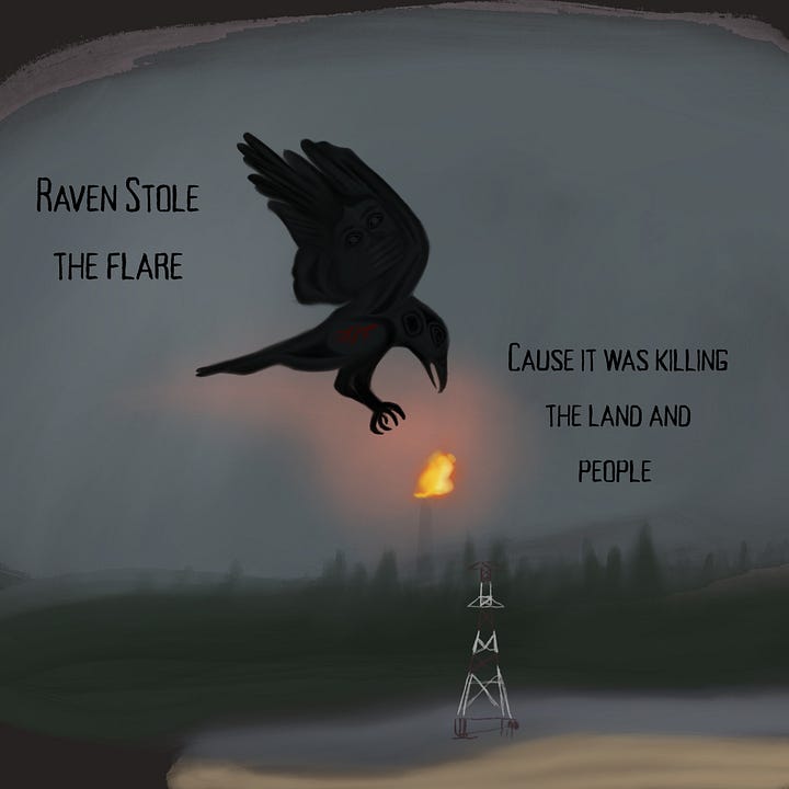 Raven is a trickster, and they play tricks or games to teach a lesson through storytelling. In this case, Raven can see and feel the harm the flare is causing to the land, animals, and people, so they take the flare away to remind the humans what fresh air feels like and how good it feels for the lungs to breathe in. Only after the smog and bright light are gone, the creatures think clearly again and can tell what time of day it is. They realize what they need to do to keep their home safe again.